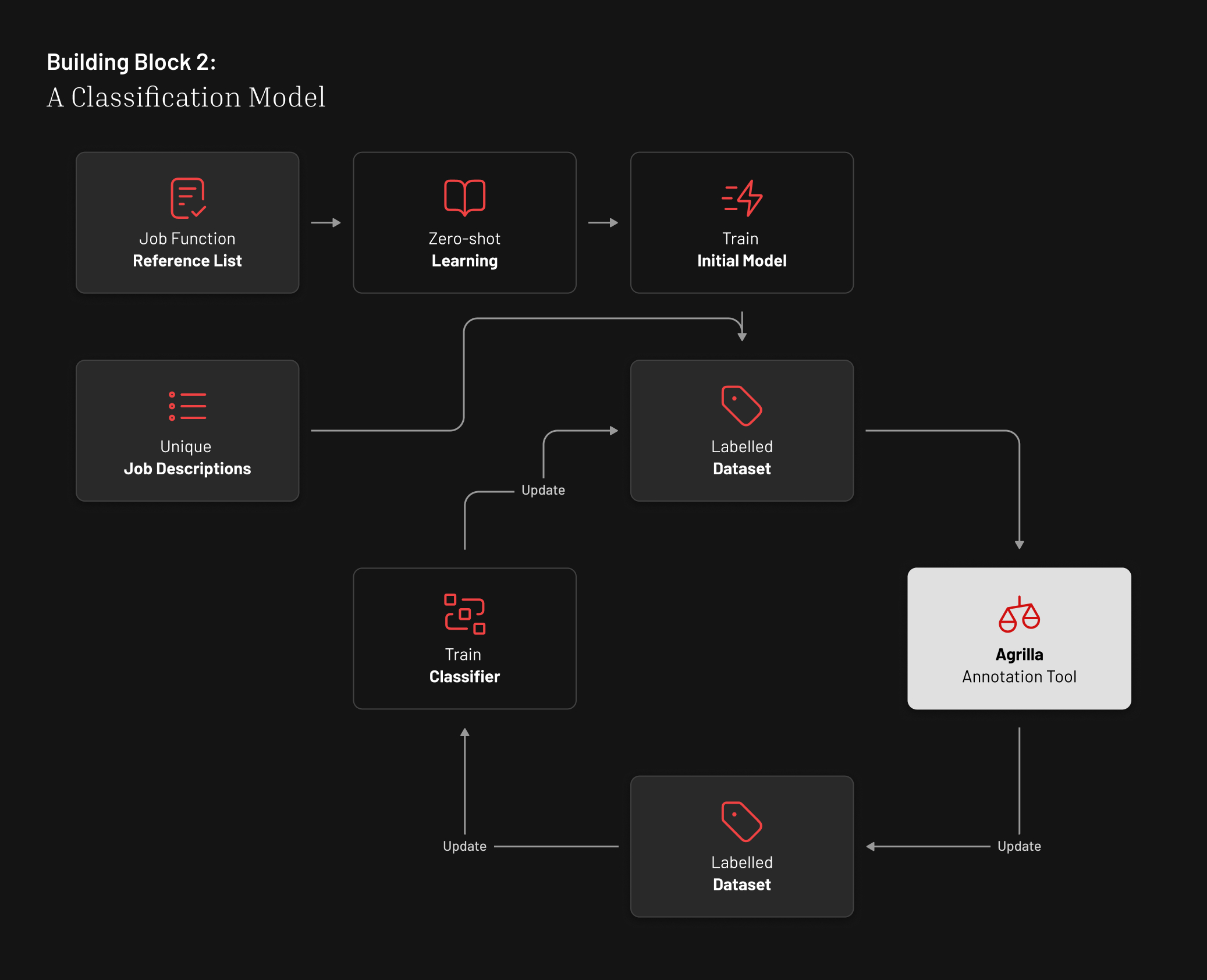The next step involved building a classification model capable of mapping each free-text job description to the correct label from the reference list. Often, a perfect one-to-one match may exist. If not, the classification model must infer the best possible match.