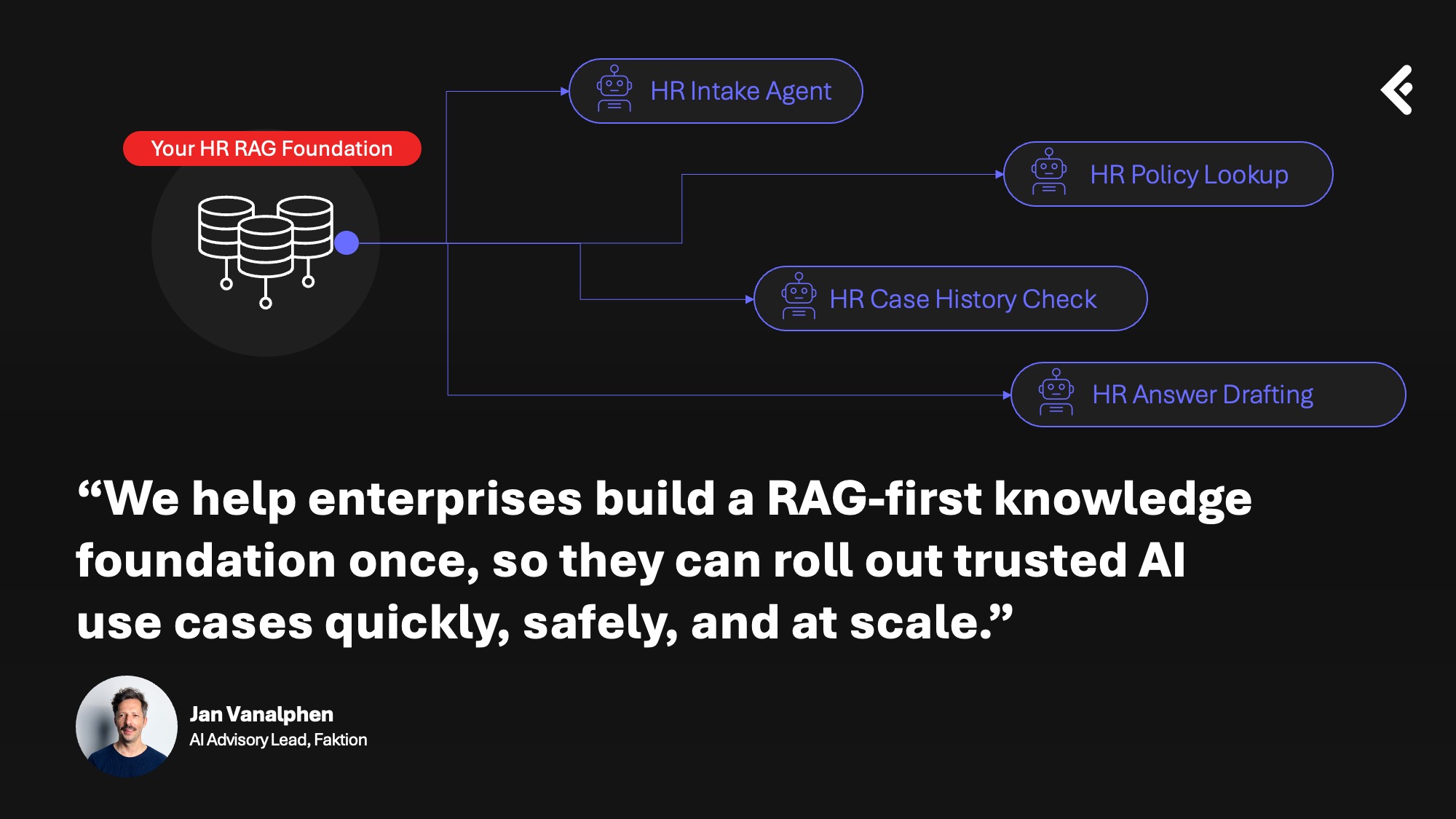 In HR, this often starts with reliable policy answers. From there, it evolves into intake agents, case history checks, policy validation, and answer drafting, all grounded in the same knowledge layer.